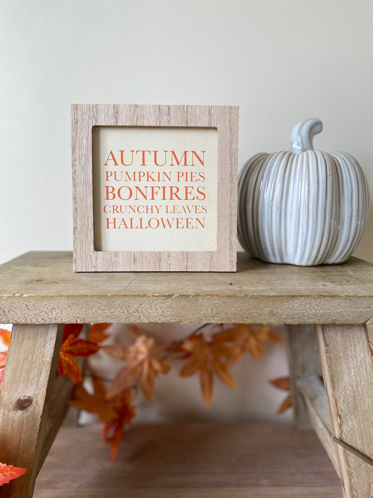 A wooden framed sign with a Halloween/ Autumn inspired text in a seasonal orange tone.