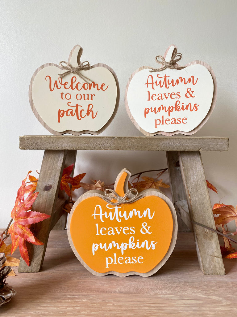 A unique wooden sign with a charming 'Autumn Leaves & Pumpkins Please or Welcome to Our patch slogan in autumnal orange and cream colours.