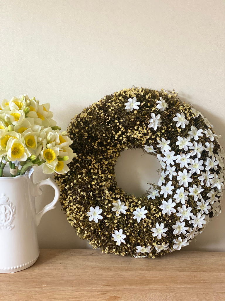 Can be hung individually or used as the base for a circular display or could be used to surround a table centrepiece. The interior ring has an internal diameter of approximately 17cm/6.75 inches and is 5cm/2 inches thick. The overall diameter is 34cm/13 inches.